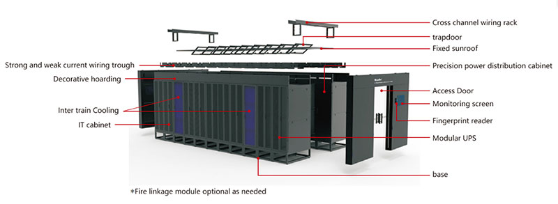 ◆ The skylight and end door are installed directly on the cabinet to save user space. The UPS, power distribution and air conditioning are of the same size, simple layout and space saving.